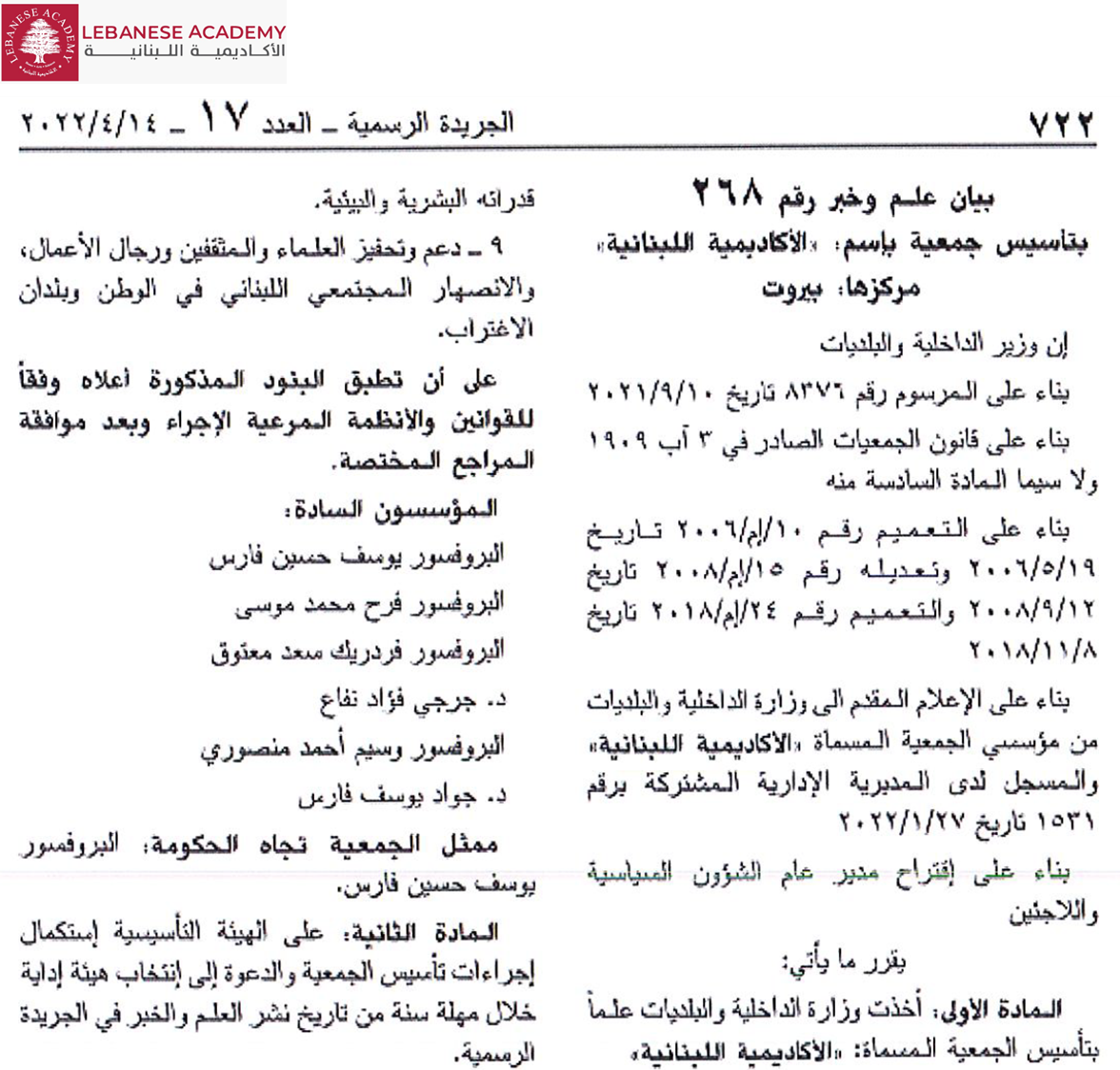 Founded by a distinguished group of scholars, including Professor Youssef Fares, Professor Wassim Mansouri, Professor Georges Naffah, Professor Farah Moussa, Professor Frederic Maatouk, and Dr. Jawad Fares, the Academy aims to provide a dynamic platform for Lebanese leaders from all fields of human endeavor. The institution is designed to explore new ideas, address critical national and global issues, and collaboratively nurture the sciences and arts.