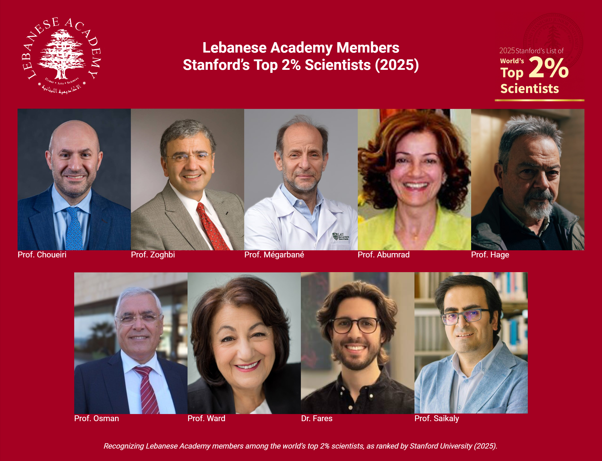 The Lebanese Academy proudly celebrates its members who have been named among the world’s top 2% of scientists, according to the 2025 Stanford University global ranking. This recognition underscores the excellence, influence, and global reach of Lebanese scholars whose pioneering work continues to shape science, medicine, engineering, and the humanities worldwide.